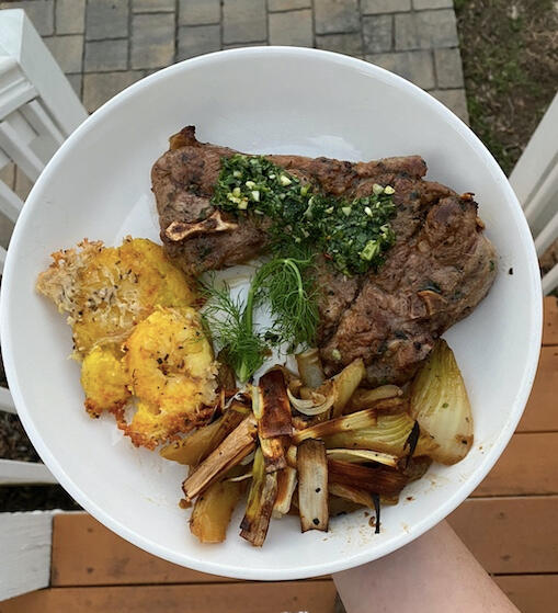 Meal 1: Garlic crusted lamb with chimichurri, braised fennel and leeks, parmesan-smashed potatoes